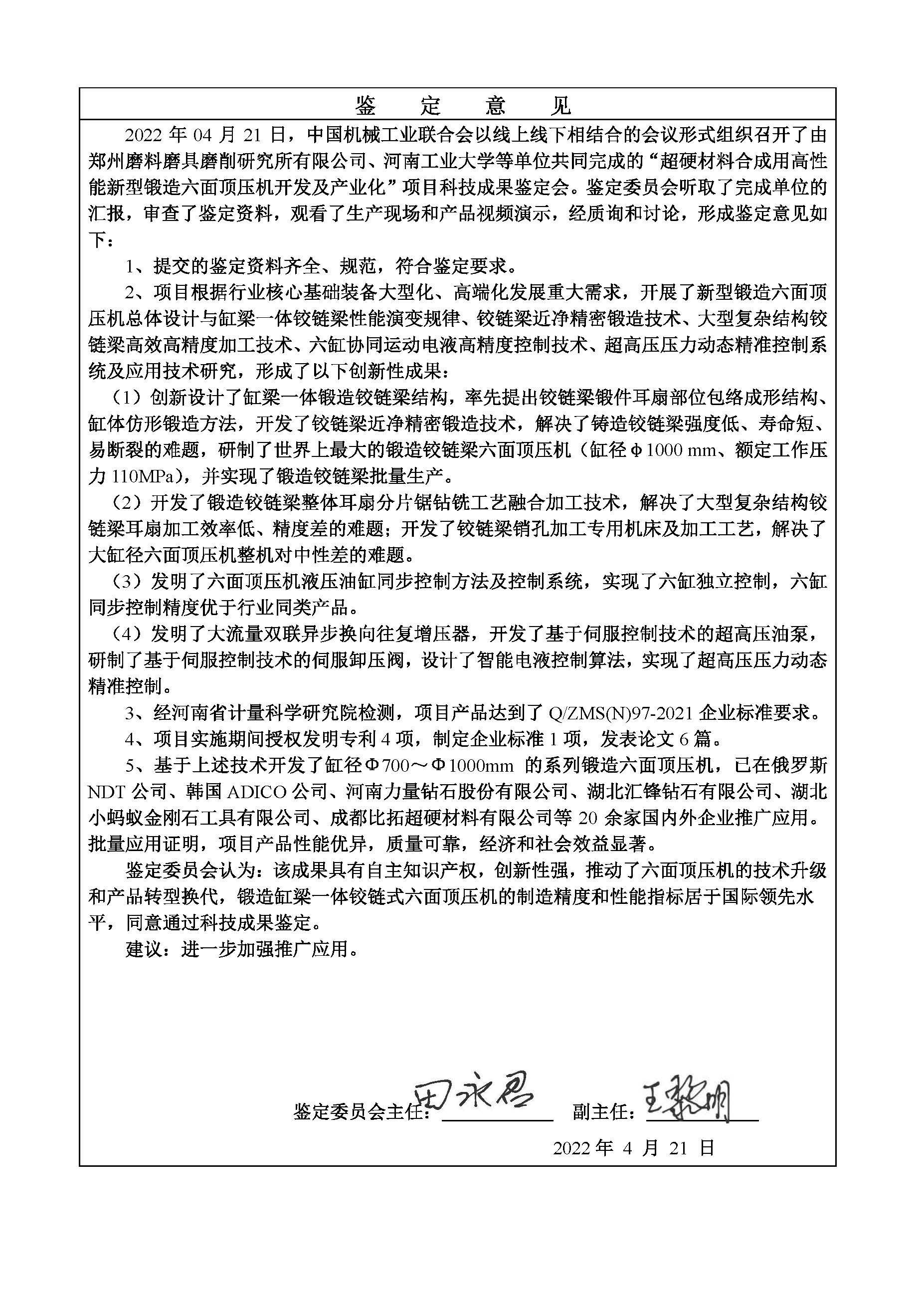 公司產品最早起源于 1965 年中國第一臺具有自主知識產權的鉸鏈式六面頂壓機,經過多年發展,公司研究開發出了系列填補國內空白的行業專用生產和檢測設備儀器; 累計授權專利 96 項,其中發明專利 36 項;7 項成果獲得國家、省部級獎勵,50 余項成果在全國開展了大面積的推廣應用,促進了我國磨料磨具、超硬材料制品行業的形成和發展,為行業和相關應用領域的發展做出了重要貢獻。